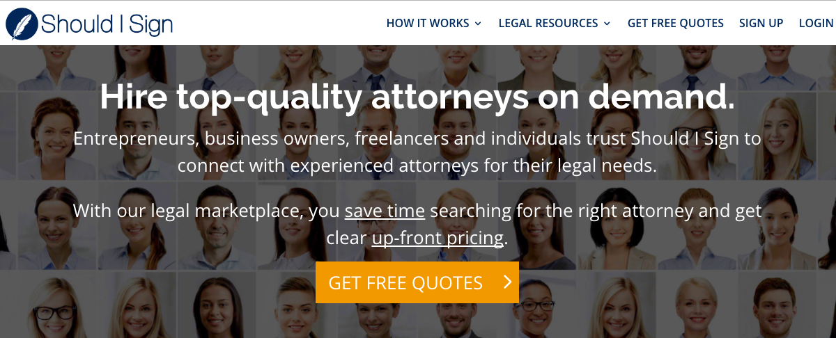 Should I Sign's legal marketplace helps entrepreneurs and small businesses find and hire pre-vetted attorneys for fixed-fee legal services (no hourly fees or surprise bills).