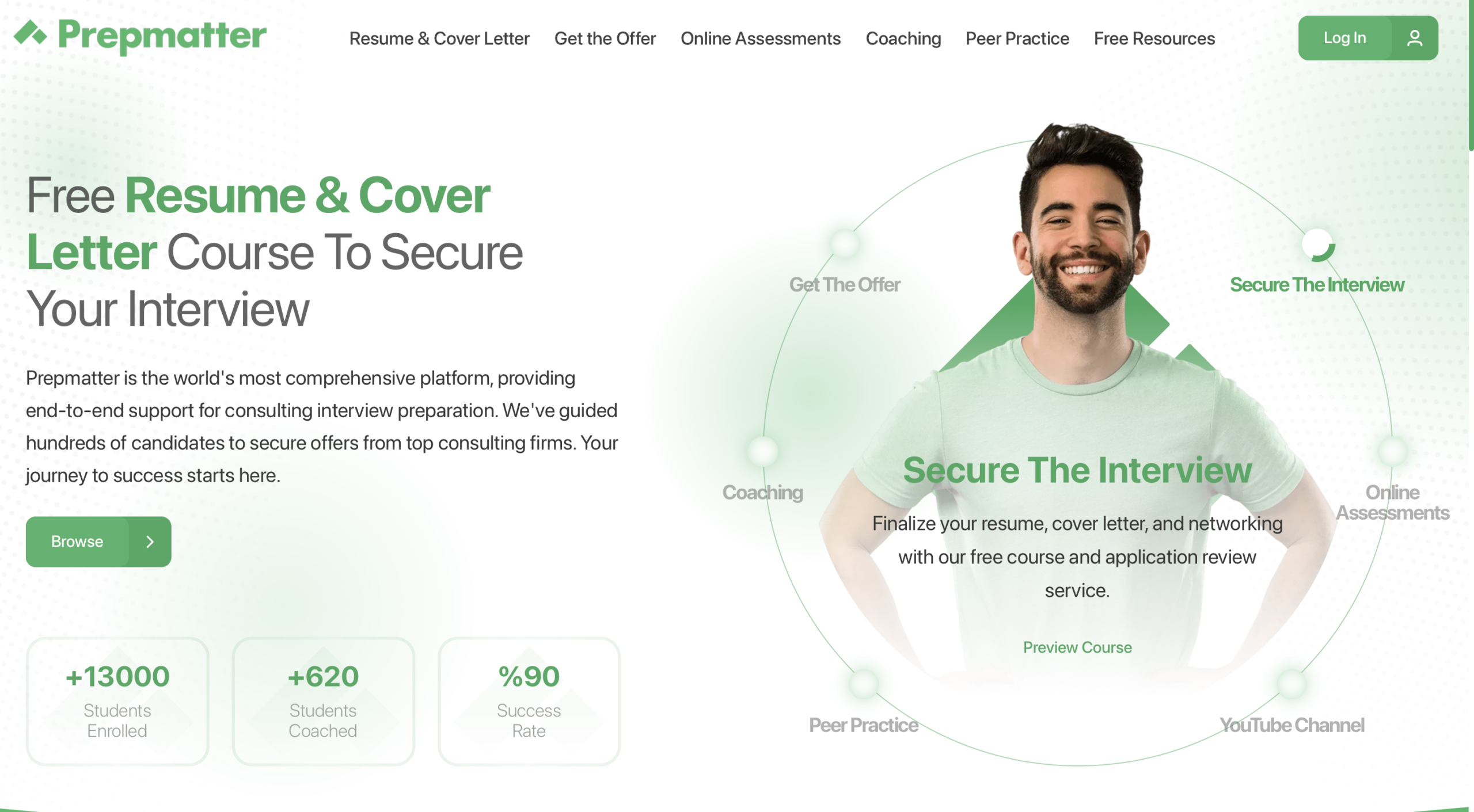 Prepmatter is an interview preparation platform designed for candidates preparing for consulting interviews at firms such as McKinsey, BCG, and Bain. It combines structured courses, realistic assessment simulations, peer practice, and coaching to support candidates throughout the full consulting interview journey.