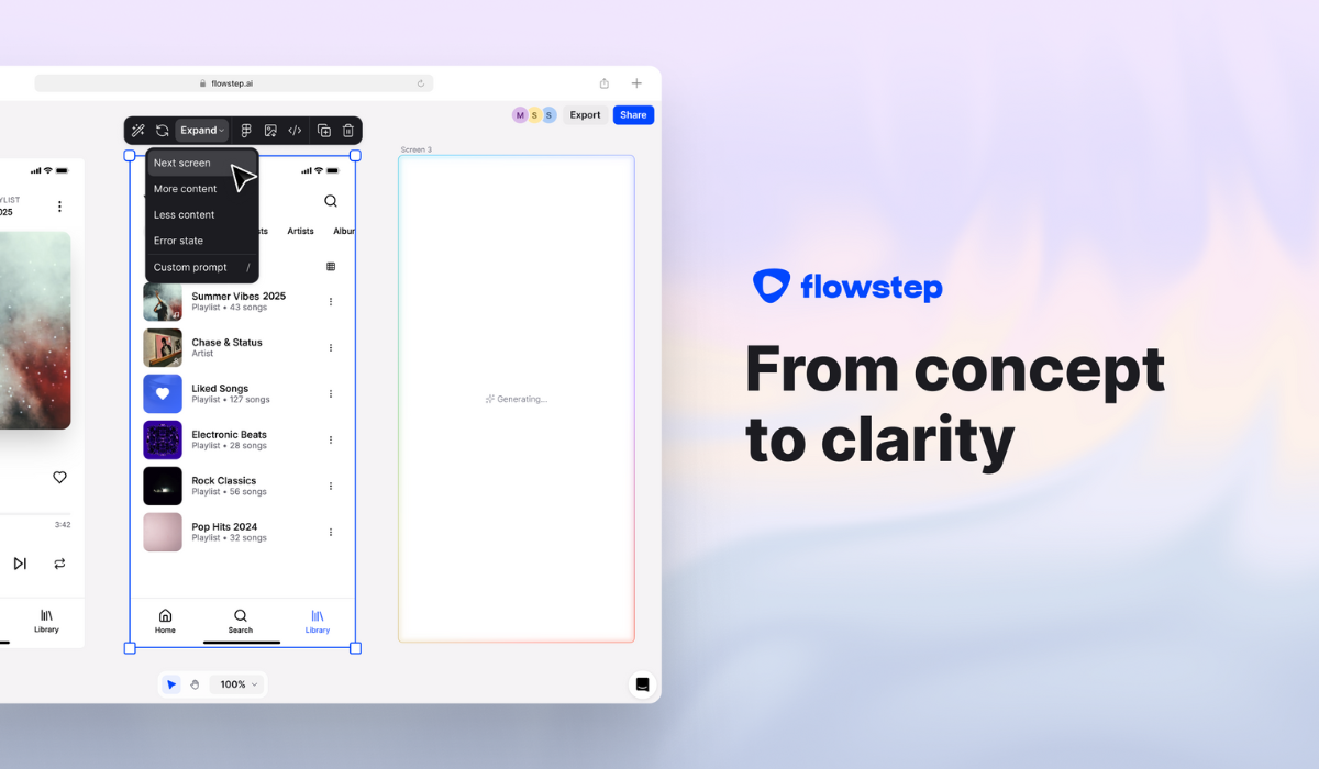 Flowstep generates real UI designs in seconds. Users can chat with Flowstep as they would with a designer. Users can add product requirements documents, links, or images for reference and inspiration.