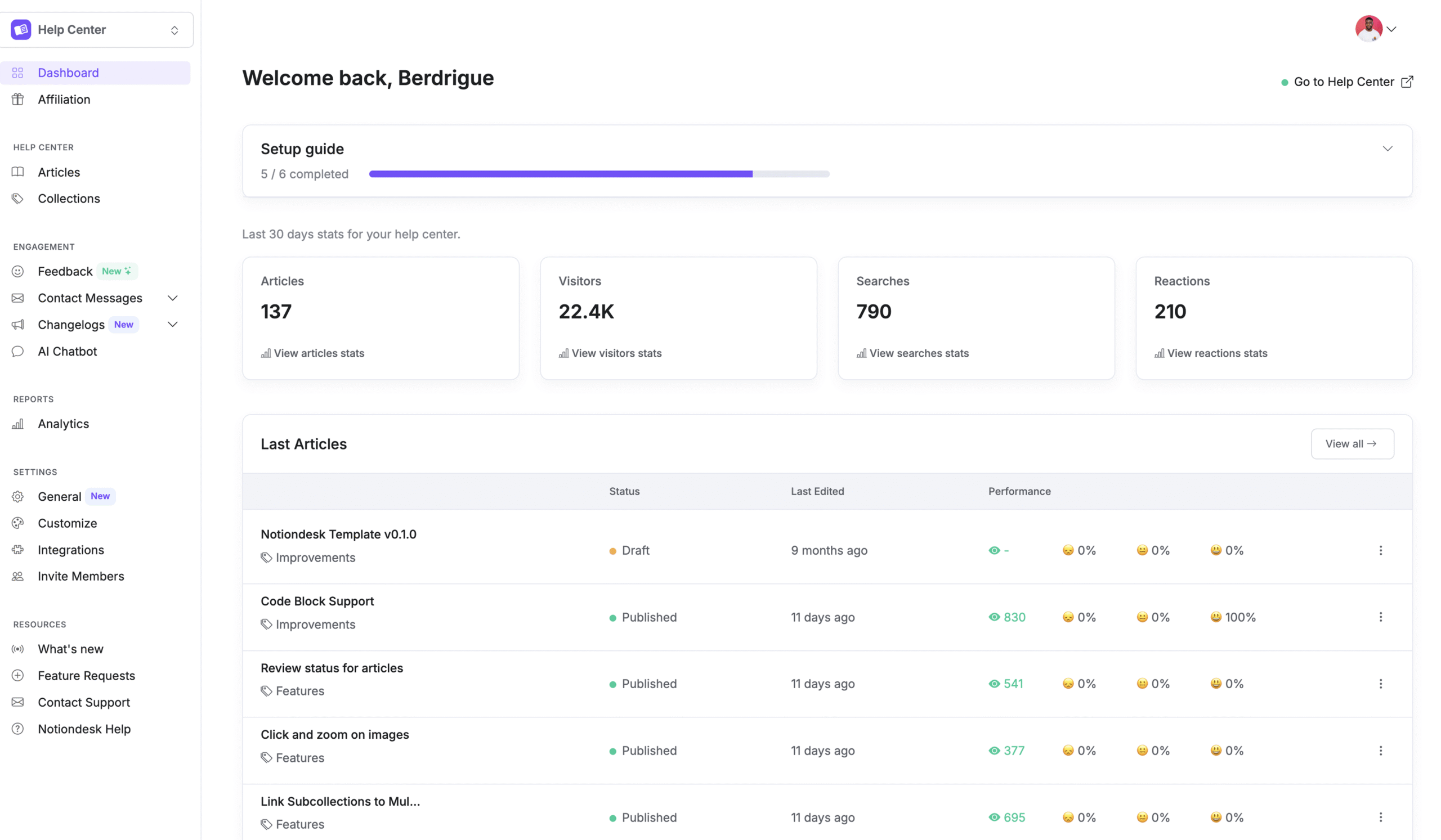 Notiondesk is the fastest way to create a public help center directly from your Notion workspace. In just minutes, transform your docs into a beautiful, multilingual knowledge base with SEO, analytics, and full customization.